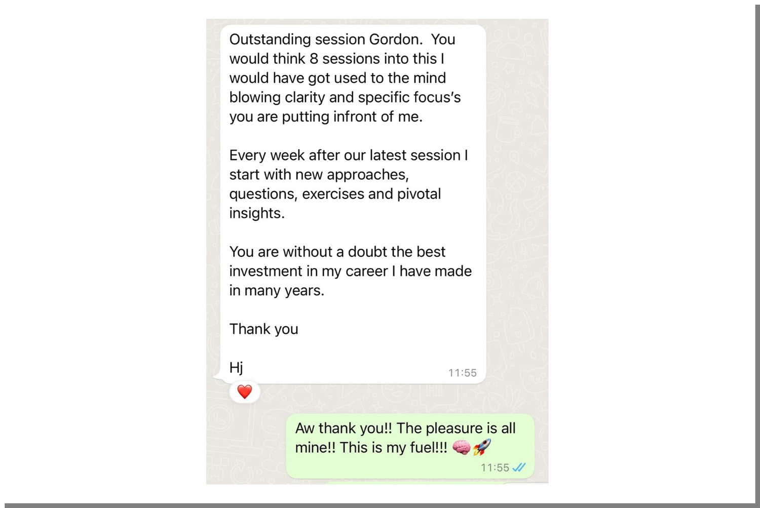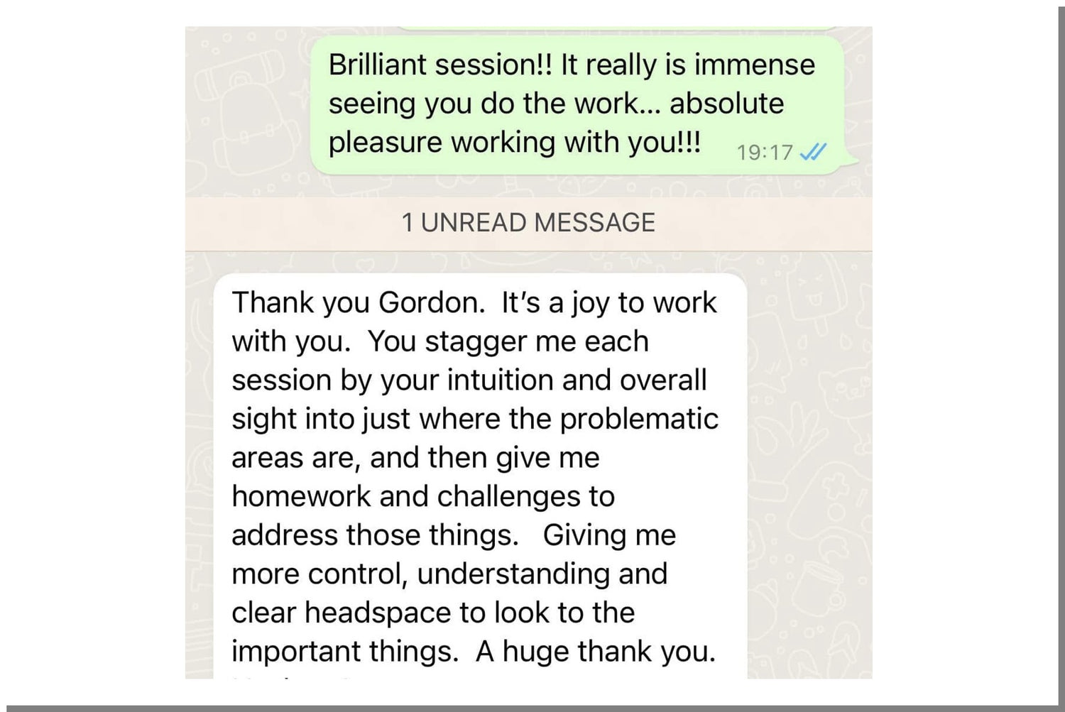 It has been an absolute joy to work with you 1 to 1... Your level of intuition and overall insights into what I should be working on is incredible... each session staggers me!